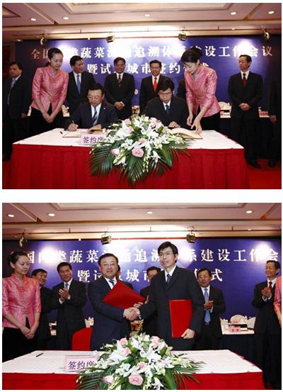 上面的照片是,中國十大城市 上海 杭州 蘇州 南京 大連 等城市的市長以及副市長級和商務部與農產品安全管理協會,簽署協議的場景照片場景